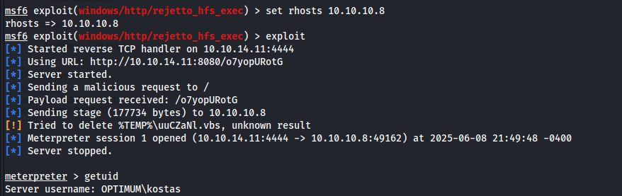 windows/http/rejetto_hfs-exec - we will use this module and set the required options and after running the module we will get the shell as